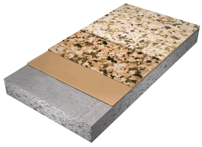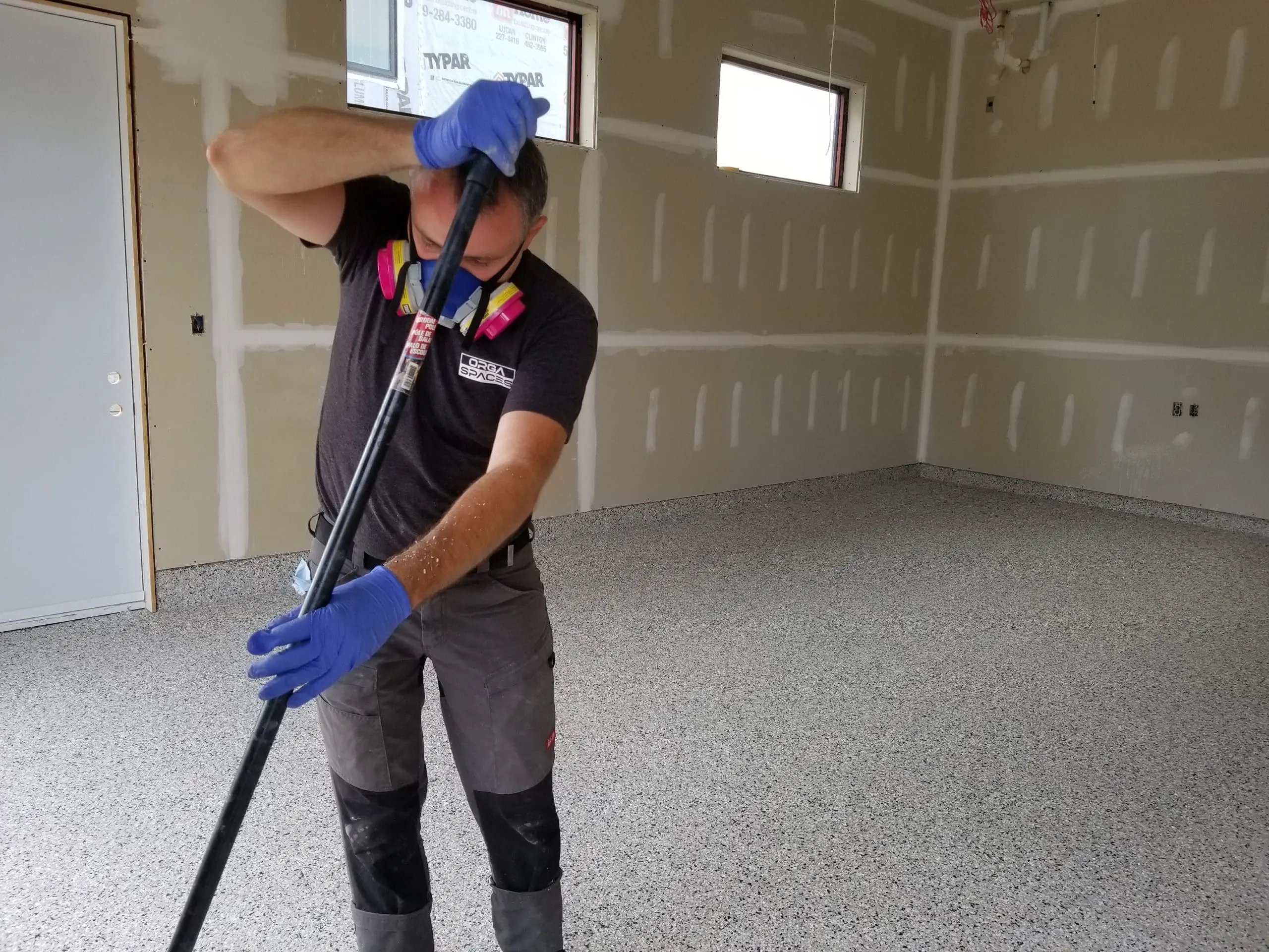 The second layer is a Flake chip broadcast of a color of your choosing, providing texture and color to your floor.